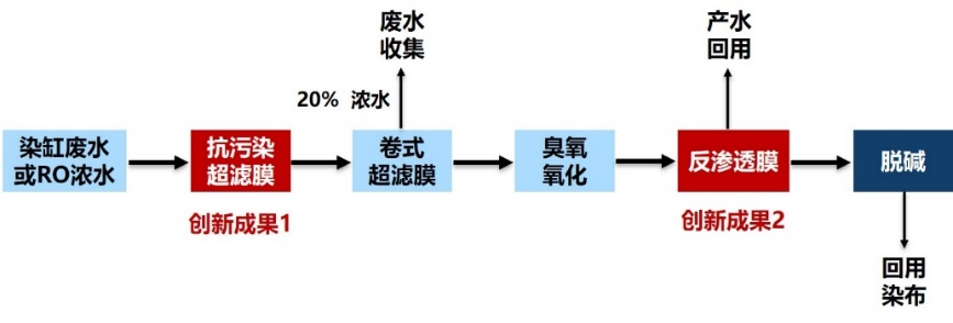 為攻克高鹽印染廢水無機鹽資源化利用難關,項目團隊巧妙設計 “元明粉循環(huán)魔方” 多級膜集成工藝。開發(fā)出液體元明粉回用的多級膜集成技術,采用“抗污染超濾膜+特種卷式超濾膜+臭氧氧化+反滲透+脫堿”工藝路線,實現(xiàn)了從預處理到深度處理再到資源回收的全流程創(chuàng)新。采用該技術回收的液體元明粉濃縮液電導率≥70000 μS/cm,色度≤50,系統(tǒng)鹽回用率75%以上,大幅降低企業(yè)成本,減少高鹽廢水污染,為印染行業(yè)的可持續(xù)發(fā)展提供了新的思路。