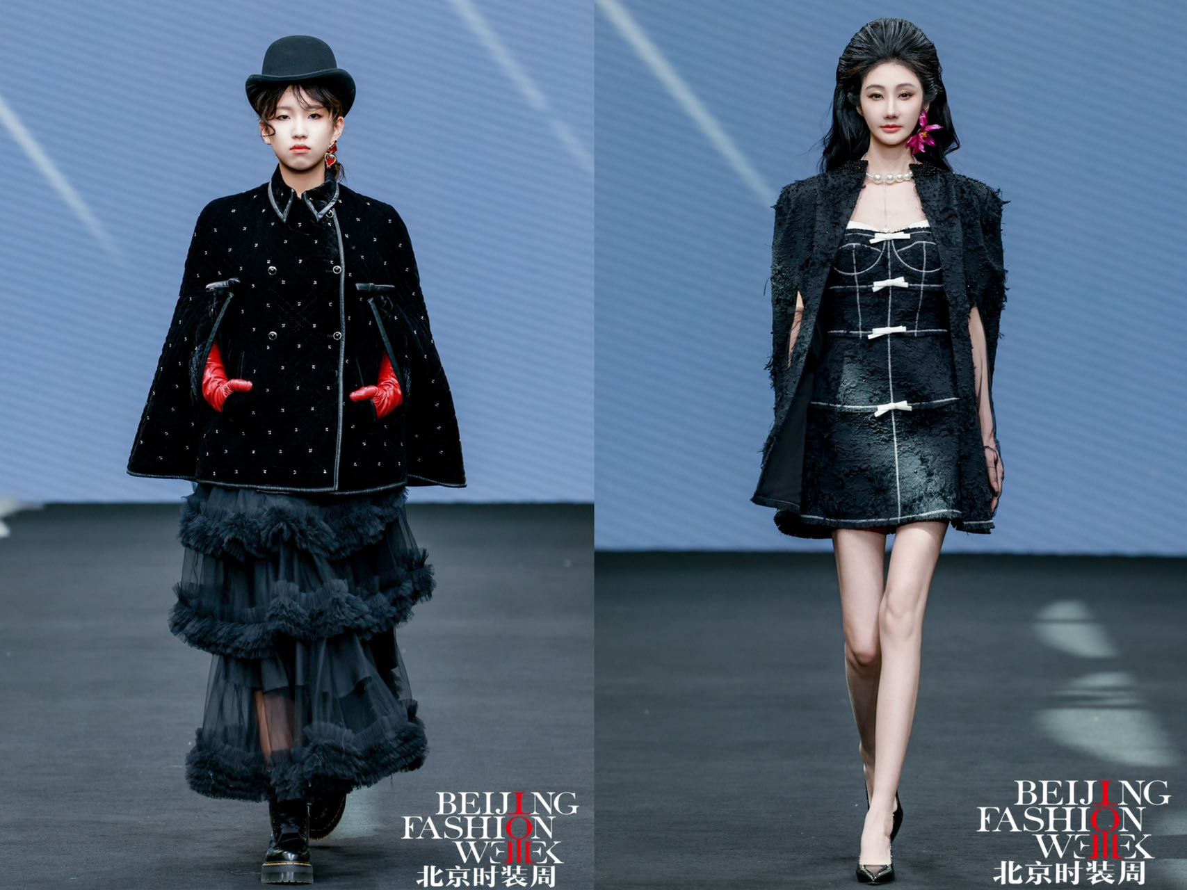 ![]() 壓軸的黑色午夜系列登場,開場模特是姜亞彤(Rachel Jiang),閉場模特為高夢涵。該系列以沉穩大氣的黑色為主色調,將觀眾拉回現實世界。最后設計師梁晨攜本場開場模特曲婧雅、壓軸模特周曼妮Mandy Jasmine Chow震撼出場。設計師借助不同材質拼接和光影運用,營造出午夜的靜謐深邃,寓意著無論白天多么精彩,最終都要回歸現實、面對自我。