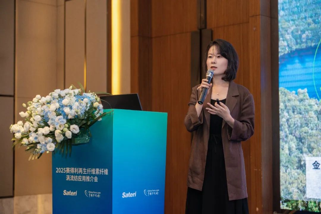 賽得利市場拓展總監潘燕華表示,紡織環境競爭加劇,產業鏈上下游需與時俱進,優化產品結構,提供質價比產品,拓寬下游渠道,積極應對挑戰。渦流紡與纖維素纖維結合是未來趨勢之一。她還介紹了優可絲?產品矩陣及萊賽爾應用現狀:優可絲?纖柔是超細旦纖維,纖細強韌,賦予面料柔和觸感;優可絲?菁彩黑色纖維符合節能環保及色牢度需求,是未來增長點。此外,萊賽爾近年發展迅猛,在梭織服裝、家紡、牛仔領域增量明顯,結合德美后交聯工藝,針織產品逐步放量,其在渦流紡開發中已形成純萊、滌萊、粘萊三大主流應用,未來潛力無限。