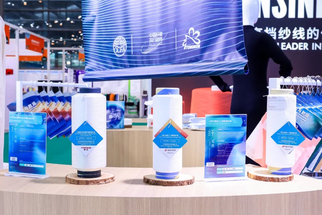 在靜態(tài)展上,面料商成為展會(huì)交流主力,其決策邏輯呈現(xiàn) “功能數(shù)據(jù)化” 特征:蘇州春盛 32.3% 中空度的高中空聚酯纖維、山東蓄熱鎖溫技術(shù)的具體指標(biāo)成為采購(gòu)關(guān)鍵參考。熱濕舒適性調(diào)控聚酯纖維因能自驅(qū)調(diào)控人體溫濕度變化,在運(yùn)動(dòng)面料領(lǐng)域備受關(guān)注;rPET/PTT 中空雙組分纖維、雙組分復(fù)合聚酰胺纖維的機(jī)械彈性升級(jí)引發(fā)觀眾熱議。此外,二氧化碳基聚酯纖維憑借碳捕集技術(shù)構(gòu)建的 “低碳壁壘”,吸引大批尋求綠色轉(zhuǎn)型的企業(yè)關(guān)注,推動(dòng)行業(yè)向 “技術(shù)參數(shù) + 場(chǎng)景驗(yàn)證” 的務(wù)實(shí)方向發(fā)展,自適應(yīng)功能與循環(huán)再生的深度融合成為下游應(yīng)用和關(guān)注的核心指向。