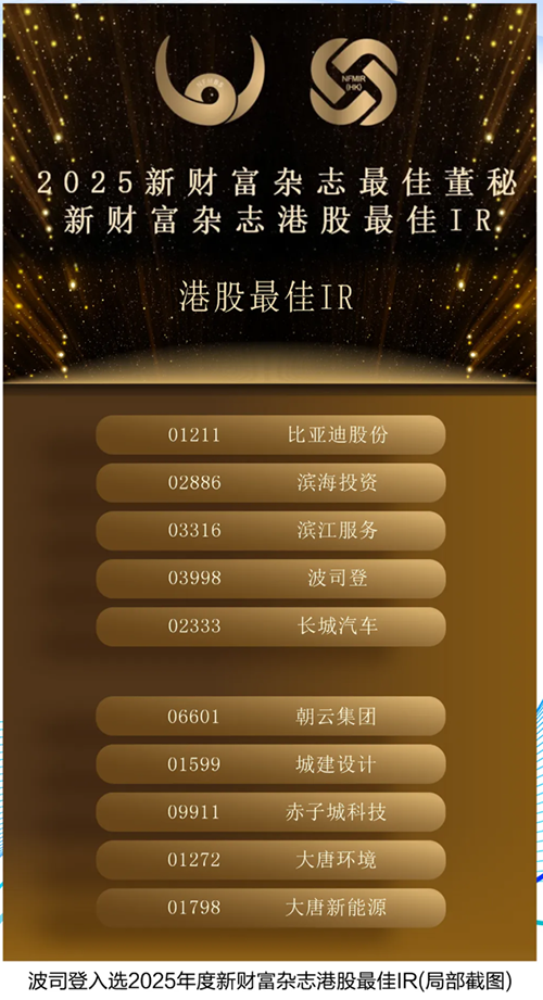政商學界領袖集結,把脈全球經濟趨勢。9月23日至24日,“新格局 新路徑——鳳凰灣區財經論壇2025”在廣州舉辦。在論壇期間揭曉的“2025鳳凰之星上市公司評選”中,波司登國際控股有限公司(3998.HK)憑借卓越的股東回報和可持續的商業價值創造,與中遠海控、東方海外國際、工商銀行、古井貢酒聯袂榮膺“最佳股東回報上市公司”獎項。