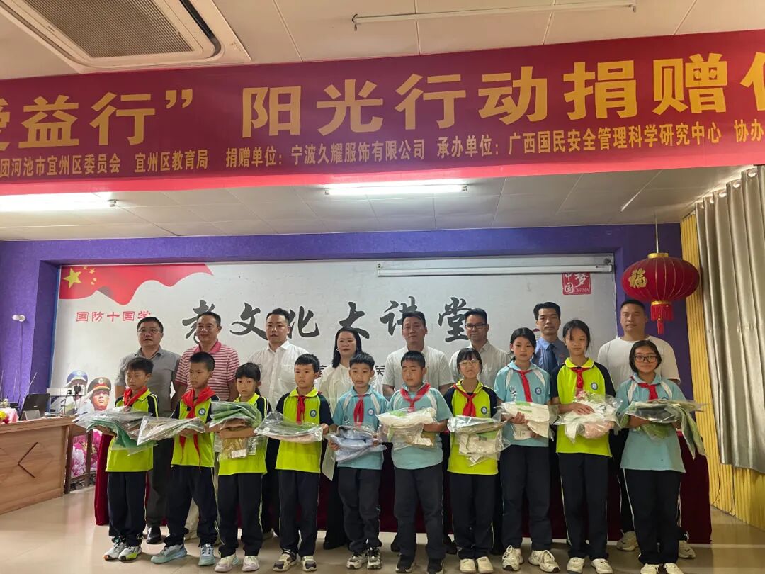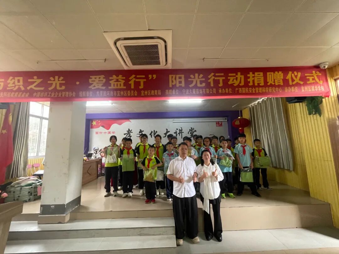 兒童是民族的未來,教育是國之根本。紡織行業作為關系國計民生的支柱產業,不僅承載著經濟價值,更肩負著推動社會進步、傳遞人文關懷的使命。在此背景下,寧波久耀服飾有限公司攜手紡織之光科技教育基金會與中國紡織工業企業管理協會開展的“紡織之光·愛益行”關愛下一代公益捐贈活動,從華東出發,跨越千山萬水,將來自紡織服裝行業的關愛與溫暖傳遞至甘肅慶陽、廣西宜州的孩子們手中,以實際行動詮釋了紡織行業企業對我國兒童成長與教育事業的深切關懷,共同繪制了一幅溫暖人心的社會責任畫卷。