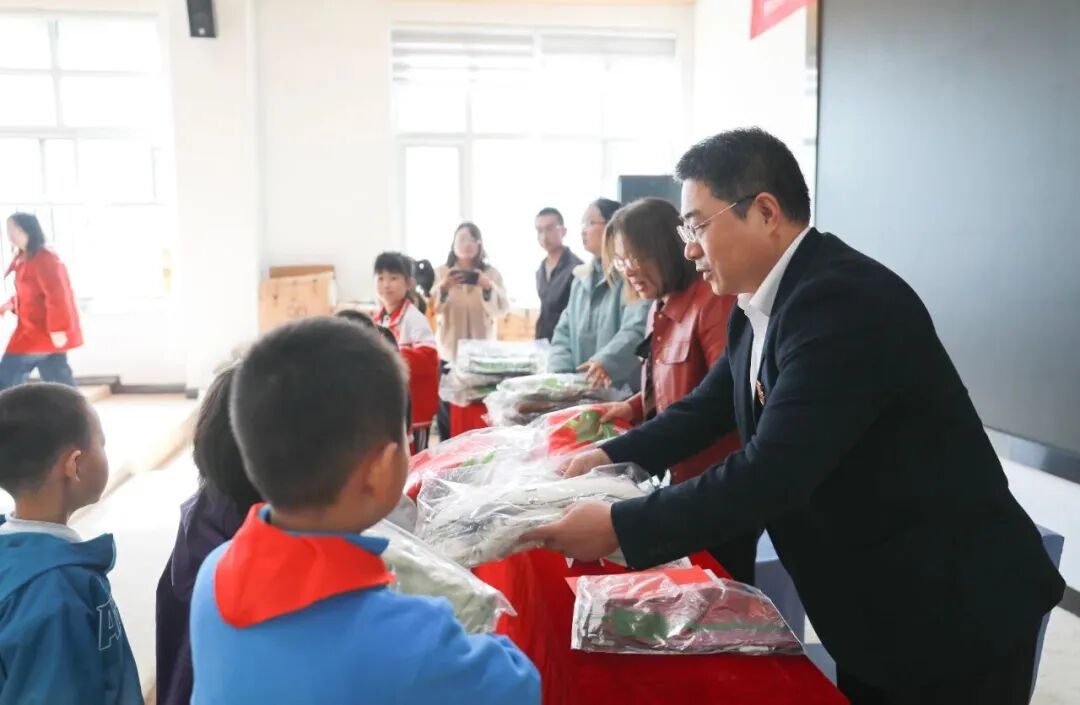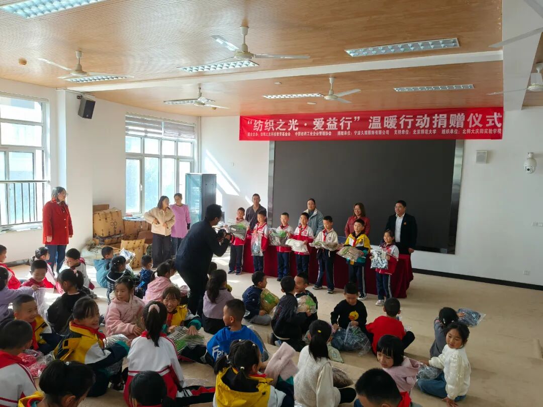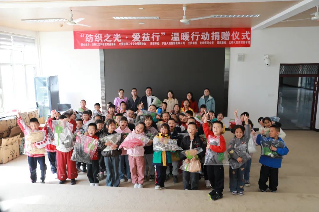 跨越千里,愛心接力。10月15日,“紡織之光·愛益行”寧波久耀走進了北京師范大學慶陽實驗學校,向該校教師子女捐贈了424件愛心服裝,為已微涼的秋季增添了濃濃暖意。