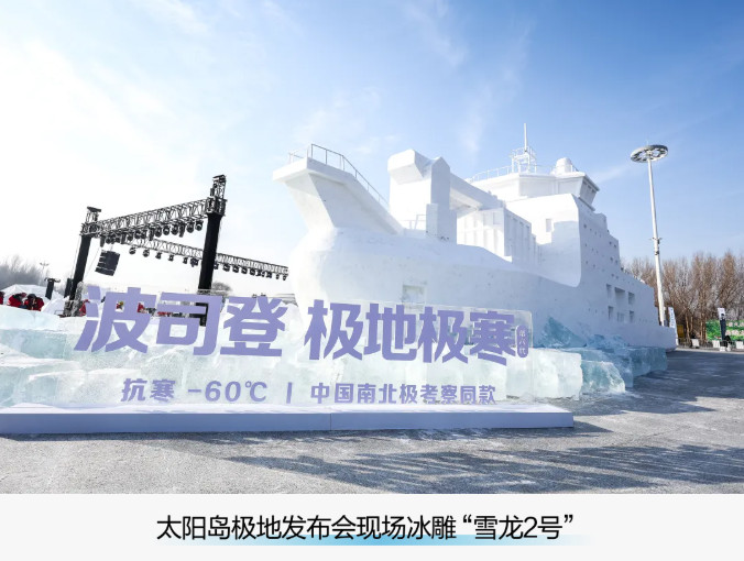 發(fā)布會現(xiàn)場,一座以中國首艘自主建造的極地考察破冰船“雪龍2號”為原型的冰雪地標亮相,由哈爾濱本土雪雕師聯(lián)手千萬級粉絲非遺文化博主江尋千打造。走近這個作品,人們仿佛親臨極地冰川,見證一個又一個關(guān)于波司登挑戰(zhàn)寒冷的故事。