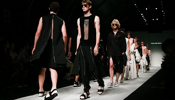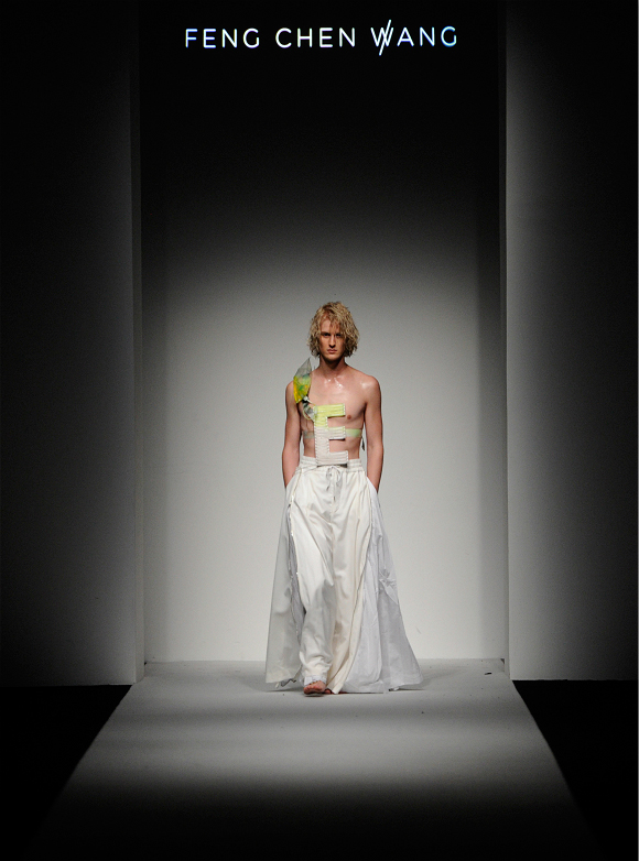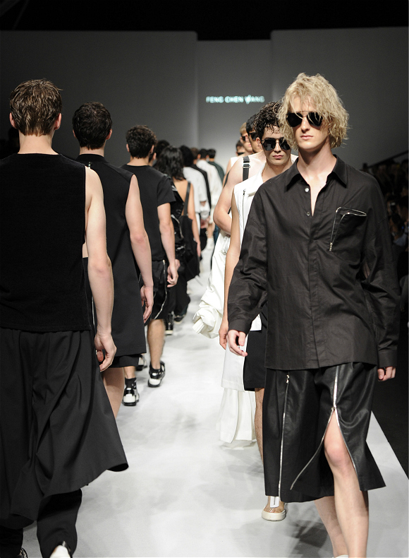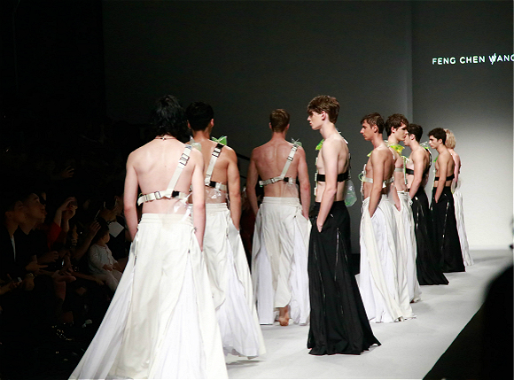 開場視頻結束后,在用強烈鼓點象征心跳聲的音樂,以及昏暗燈光交互出的神秘氣氛中,9個男模步出T臺排成一列,男裝品牌FENG CHEN WANG在上海時裝周的2016春夏秀正式開始。模特的頭發被打理成沐浴后沾濕的效果,身上細細地噴上了水珠,看得出這是一場精心籌備和對細節嚴格把控的時裝秀。