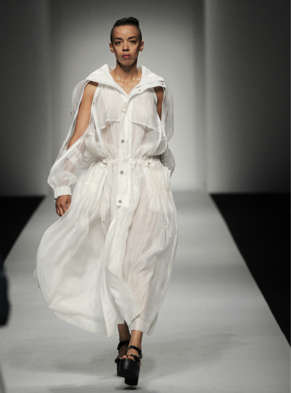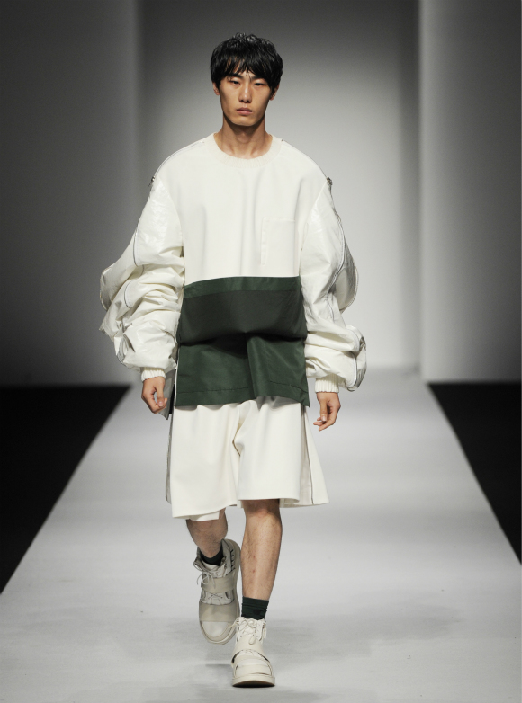 FENG CHEN WANG 2016春夏系列 回到今年6月,界面記者在倫敦見到設計師王逢陳時,她剛剛忙完英國皇家藝術學院的畢業秀。雖然接到上海時裝周邀請,但還在猶豫是否要參加。當時,個子嬌小,留著Anna Wintour式波波頭的王逢陳征詢同班好友意見:“你說我要不要去?去的話,時間會很趕,幾乎沒有休息的時間。” 時隔4個月,她帶著畢業后的首個系列來到上海,走秀編排、配套的訂貨會、甚至秀后的After Party,很難想象,這竟然會是畢業生的手筆。 這一名為“生命與愛”的系列背后講的是她父親和病魔斗爭的故事。因此,在這場秀上,你看到了裝飾用的熒光血漿包、象征內臟的巨型羽絨包袱。系列在色調上以黑白和綠色為主,前兩種是醫院中環繞病患和陪同家屬的色彩以及他們的心情,綠色意味著希望。 在細節上,這位設計師用拉鏈表現剛剛縫合的傷口,有些撕扯開來,有些正在愈合。它們的功用在秀臺上只能展現一二。王逢陳在上海訂購會上忙碌地向預約買手介紹系列背后的故事、摘脫效果以及特殊面料。 身為終端買家的消費者只有等到明年3月之后才能看到這些衣服。目前確定下單的零售商中有連卡佛,“我們給連卡佛的交貨期是今年12月到明年3月。”王逢陳說道。 今年5月7日,上海連卡佛曾舉了一場名為“新品牌集結號”的精選賽,選拔新晉設計師。王逢陳在收到學校推送的連卡佛選拔郵件后,從倫敦直飛上海,并作為優勝者之一贏得連卡佛的訂單。 比賽當日,參賽者眾多,她卻是界面記者看到的唯一一位帶著男模做展示的服裝設計師,而且還是曾走過國際時裝周的男模嚴愷文。王逢陳告訴界面新聞,對于2014年創立才成立的FENG CHEN WANG而言,能在起步階段得到連卡佛這樣具有行業影響力的客戶垂青,“是種莫大的鼓勵”。