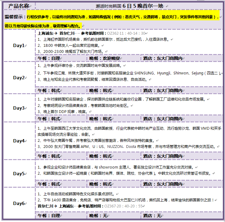 以上行程可根據實際情況對順序作出調整,不足15人不成團! 報價包含: 1.全程國際機票費用、燃油附加稅; 2.全程韓國當地酒店標準間住宿; 3.全程旅游巴士(含保險); 4.全程中文翻譯、WIFI; 5.韓國資深買手、時尚導游、行業代表全程指導互動; 6.酒店內自助早餐,行程中所列的午晚正餐; 7.境外旅游人身傷害意外險; 8.中韓文化交流榮譽書授予。 報價不含: 1.個人護照辦理費用、簽證費用; 2.航空保險費、行李保險費、超重行李費; 3.酒店客房、行李員、餐館等其它自愿支付小費; 4.各項私人額外費用如:洗衣、長途電話、酒水等消費; 5.行程外任何觀光項目及自費活動(包括這些活動期間的用車、導游和司機服務等費用); 6.單人間房差:400元/人/晚*5晚; 7.因私人原因、交通延阻、罷工、臺風或其它不可抗力因素而產生的額外費用。 |