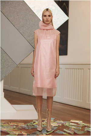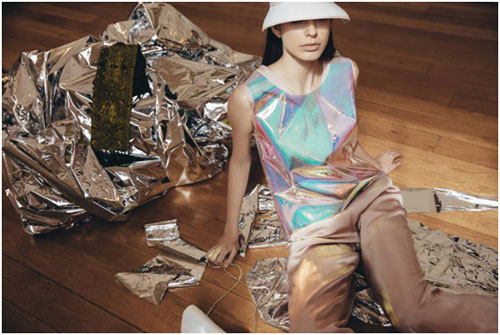 模特身穿HUI 2019春夏系列在presentation展覽上 將古代與現(xiàn)代的字符相碰撞,散發(fā)出神秘并卻像探究的氣息。以簡潔和流利的線條襯托女性完美曲線展現(xiàn)HUI多變的設(shè)計(jì)。