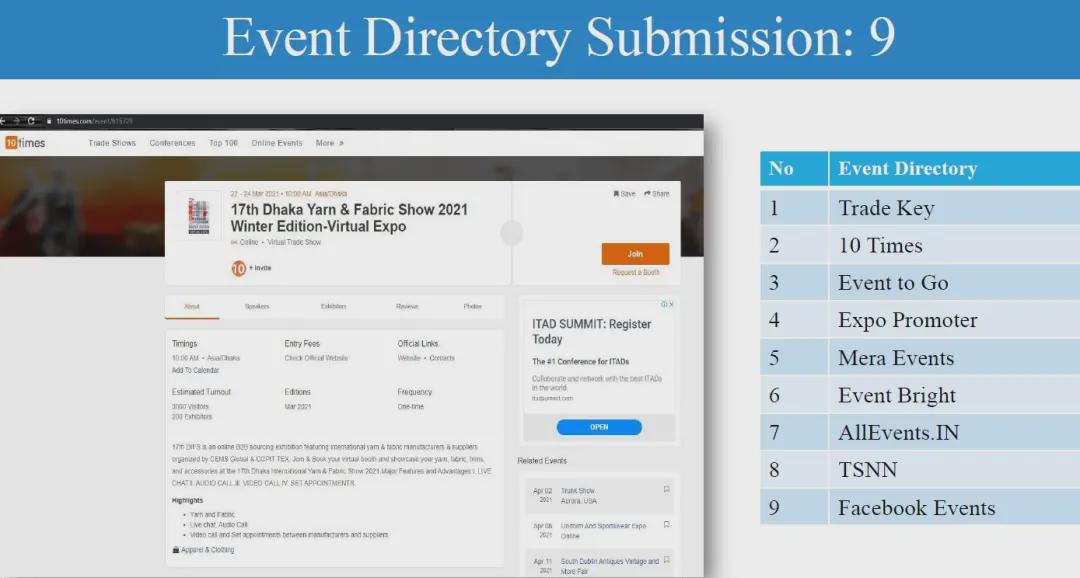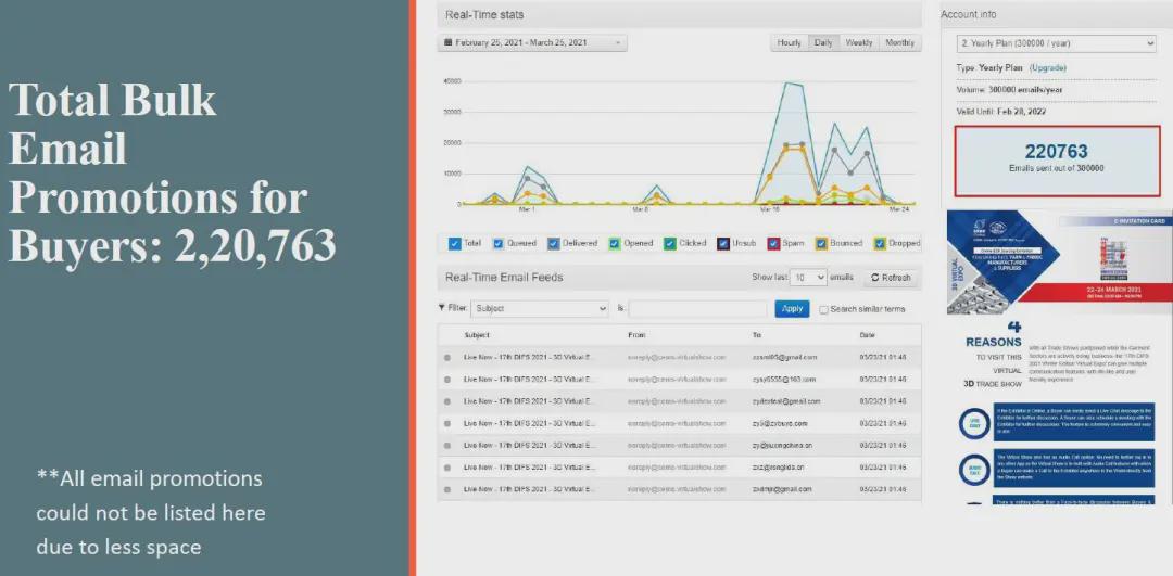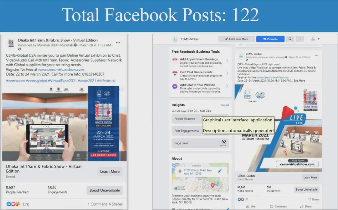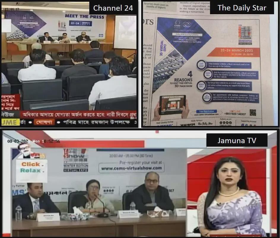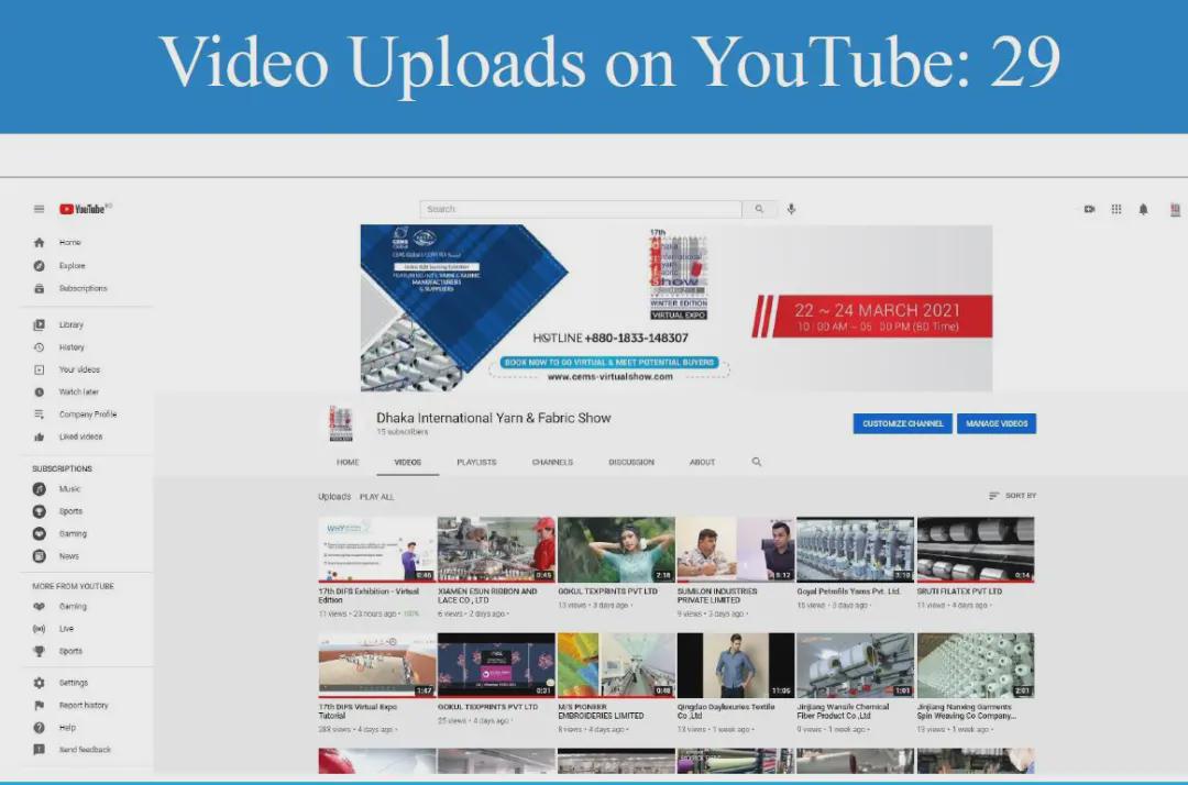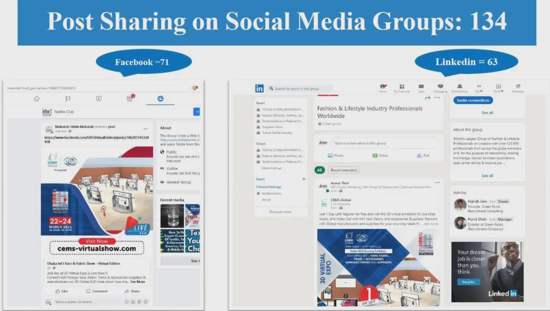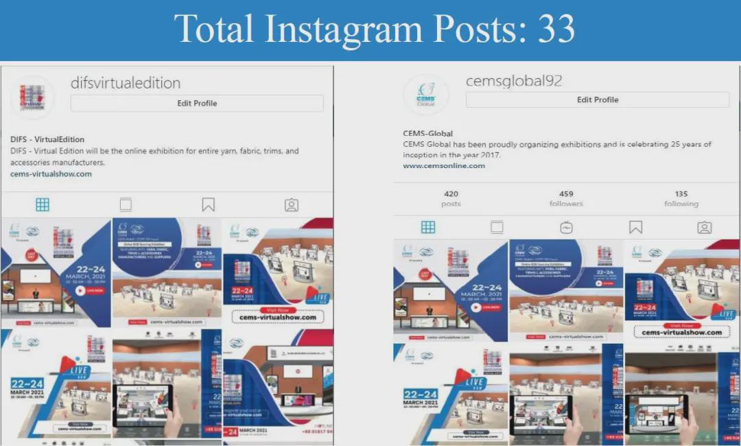 面對疫情的沖擊和挑戰,中國國際貿易促進委員會紡織行業分會與展會合作方CEMS Global積極探尋解決方案,最終決定將實體展會從ICCB展館搬到云端。展會于2021年3月22-24日舉行,三天觀眾人數達到1,208名專業采購商,來自中國和印度等亞洲國家共計53家企業參展,平均每家參展商與20家采購商建立聯系。 展會宣傳匯總PROMOTION CAMPAIGN