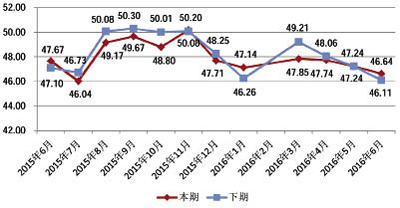 PMI指數仍處于不景氣區 2016年6月,男裝制造業采購經理人指數(PMI)仍在臨界點以下,處于不景氣區,指數值收于49.69點,環比下降0.16個百分點,同比下降0.25個百分點。 中國·常熟男裝制造業采購經理人(PMI)指數走勢