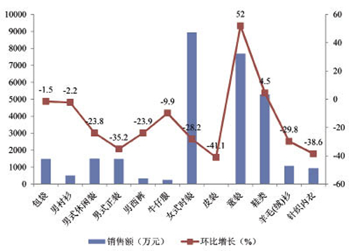 銷售分析 多數品類延續下滑趨勢 2016年6月,上海各服裝品類銷售額中,絕大多數品類均延續了上月的下滑趨勢。其中,皮裝、針織內衣、男式正裝環比降幅超30%,羊毛(絨)衫、女式時裝、男西褲、男式休閑裝環比降幅超20%,而童裝環比增長52.0%表現優異。 2016年6月上海各服裝品類銷售情況