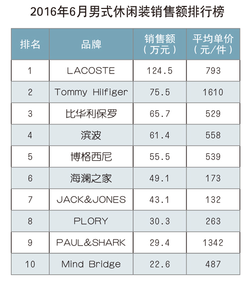 男式休閑裝 2016年1~6月,男式休閑裝累計銷售量為22.5萬件(套),同比下降21.7%;累計實現銷售額1.51億元,同比下降16.3%;平均銷售價格為670.0元/件(套),同比增長6.8%。2016年6月,銷售額前三強中,“LACOSTE”重獲第一名,環比增長19.6%;連續3個月奪冠的“Tommy Hilfiger”品牌本月獲得第二名;“比華利保羅”品牌首次躋身三強。