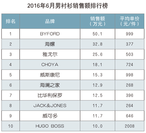 男襯衫 2016年1~6月,男襯衫累計銷售量為6.9萬件,同比下降18.2%;累計實現銷售額2918萬元,同比下降10.7%;平均銷售價格為420.7元/件,同比增長9.1%。2016年6月,銷售額前三強中,“BYFORD”品牌超越已經五連冠的“海螺”品牌,本月獲得排行榜第一名;“海螺”品牌屈居第二,銷售額環比下降15.5%;“雅戈爾”品牌環比下降12.6%,獲得第三名。