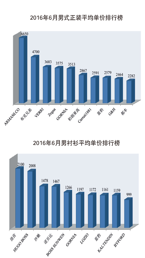 男式正裝 2016年1~6月,男式正裝累計銷售量為12.1萬件(套),同比下降3.8%;累計實現銷售額1.69億元,同比下降6.5%;平均銷售價格為1394.6元/件(套),同比下降2.8%。2016年6月,銷售額前三強中,“callisto”品牌本年度首次奪冠,銷售額環比下降23.7%;“威斯康尼”品牌排名第二,環比下降39.1%;“藍豹”品牌環比下降42.0%,獲得第三名。