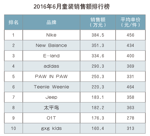 童裝 2016年1~6月,童裝累計銷售量為131.4萬件(套),同比下降0.6%;累計實現銷售額3.58億元,同比增長5.3%;平均銷售價格為272.3元/件(套),同比增長5.9%。2016年6月,銷售額前三強中,“Nike”品牌環比增長23.3%,再次蟬聯排行榜第一名;“New Balance”品牌獲得第二名,環比增長62.0%;“E-land”品牌蟬聯第三名,銷售額環比增長51.0%。