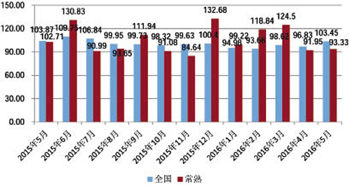 據(jù)中國·常熟男裝出口環(huán)比價格指數(shù)顯示,2016年5月,全國男裝出口環(huán)比價格指數(shù)收于103.45點,出口環(huán)比價格指數(shù)在連續(xù)4個月低于100點后,本月首次突破100點,開始回升;常熟男裝出口環(huán)比價格指數(shù)收于93.33點,出口價格延續(xù)上月下降走勢,但降幅有所縮小。 男裝出口環(huán)比價格指數(shù)