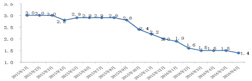 中華全國商業信息中心/數據來源及分析 市場縱覽 根據國家統計局的數據,2016年6月國內服裝類商品居民消費價格同比上漲1.4%,相比上年同期價格漲幅回落1.5個百分點,1~6月累計上漲1.6%,漲幅較上年同期回落1.3個百分點。 另據中華全國商業信息中心的統計,6月份全國重點大型零售企業服裝零售價格相比上年同期上漲0.4%。 2015~2016年各月服裝類商品居民消費價格漲幅(%)