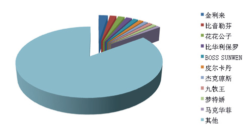 數據來源:中華全國商業信息中心 品牌份額 T恤衫 根據中華全國商業信息中心的統計,2016年6月份全國重點大型零售企業T恤衫銷售前十位品牌市場綜合占有率合計達到14.78%。金利來、比音勒芬和花花公子占據前三位。 T恤衫銷售前十名品牌
