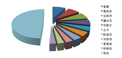 女性內衣 根據中華全國商業信息中心的統計,2016年6月份全國重點大型零售企業女性內衣銷售前十位品牌市場綜合占有率合計達到50.77%,愛慕、曼妮芬和安莉芳占據前三位。 女性內衣銷售前十名品牌