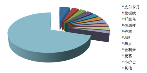 保暖內衣 根據中華全國商業信息中心的統計,2016年6月,全國重點大型零售企業保暖內衣銷售前十位品牌市場綜合占有率合計為29.71%,皮爾卡丹、北極絨和纖絲鳥占據前三位。 保暖內衣銷售前十名品牌