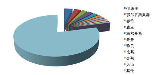羊毛衫 根據中華全國商業信息中心的統計,2016年6月,全國重點大型零售企業羊毛衫銷售前十位品牌市場綜合占有率合計為20.91%,恒源祥、鄂爾多斯奧群和春竹占據前三位。 羊毛衫銷售前十名品牌