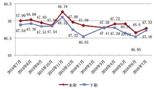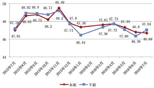 從構成常熟男裝制造業采購經理人指數的主要二級指標的景氣度情況來看,各項二級指標均位于不景氣區間,且除生產經營人員景氣指數走勢平穩,較上月微升0.03個百分點外,生產總量、產品訂貨、原材料庫存數量、供應商配送景氣指數均較上月下降。其中生產總量景氣指數收于49.97點,環比下降0.54個百分點,同比下降0.27個百分點,反映廠家產品生產總量較上月有所減少;產品訂貨景氣指數收于48.55點,環比下降0.17個百分點,同比下降0.57個百分點,反映廠家訂貨量較上月減少,且降幅有所增加;原材料庫存數量景氣指數收于49.64點,環比下降0.13個百分點,同比下降0.25個百分點,反映本月廠家原材料庫存數量略有下降;供應商配送景氣指數今年首次低于50點,收于49.97點,環比下降0.39個百分點,同比下降0.51個百分點,反映原材料供應配送時間較上月放緩。該月暴雨天氣較多,且周邊省市發生洪澇災害,對物流配送影響較大。 部分廠家開始秋冬裝生產,生產景氣指數有所回升。據中國·常熟男裝生產景氣度指數(圖3)顯示,7月男裝生產景氣度指數收于47.33點,環比上升0.73個百分點,同比下降0.66個百分點。 圖3 中國·常熟男裝生產景氣度指數走勢
