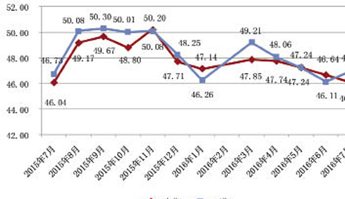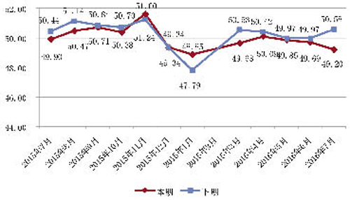 該月男裝市場進入淡季,人流較少,銷售以零售為主,大多商戶開始夏休或者對商鋪進行裝修,為下半年秋冬裝上市做準備,男裝市場景氣指數環比仍降;生產方面,部分廠家開始秋冬裝生產,生產景氣度指數開始回升。 從下期預測值來看,下期景氣指數收于47.04點,略高于7月景氣指數0.35個百分點;企業預計下月景氣指數將略有回升。 7月男裝生產景氣度情況 男裝制造業采購經理人指數(PMI)指數仍處于不景氣區。7月,男裝制造業采購經理人指數(PMI)仍在臨界點以下,處于不景氣區,指數值收于49.20點,環比下降0.49個百分點,同比下降0.70個百分點。這表明男裝制造業略有收縮之勢,但從下期預測景氣指數收于50.58點看,企業對下期經營情況的好轉有信心。 圖2 中國·常熟男裝制造業采購經理人(PMI)指數