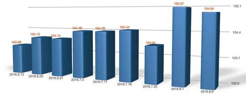 “中國·柯橋紡織指數”20160808期紡織品價格指數收報于104.94點,環比下跌0.12%,較年初上漲0.84%,同比上漲2.48%。 總價格指數