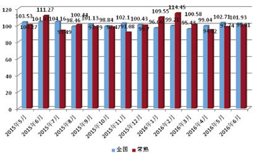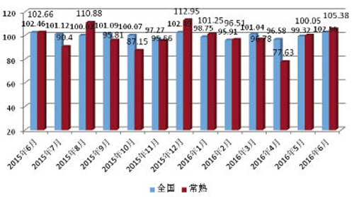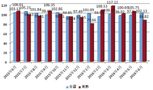 中國·常熟男裝出口價(jià)格指數(shù)根據(jù)海關(guān)編碼分類結(jié)合常熟地區(qū)男裝產(chǎn)品特點(diǎn),對(duì)常熟地區(qū)主要出口的正裝與休閑服進(jìn)行了采集與分析,用來反映男裝出口的整體價(jià)格走勢(shì),數(shù)據(jù)來源于中國海關(guān)。本指數(shù)主要包括正裝與休閑裝,而運(yùn)動(dòng)服、內(nèi)衣、職業(yè)工裝、童裝、短褲及手工制品不包含在內(nèi)。 男裝出口價(jià)格全國環(huán)比上升,常熟環(huán)比下降 據(jù)中國·常熟男裝出口環(huán)比價(jià)格指數(shù)顯示,2016年6月,全國男裝出口環(huán)比價(jià)格指數(shù)收于106.21點(diǎn),出口價(jià)格繼續(xù)上漲。全國出口各大類男裝中,僅上衣外套出口價(jià)格環(huán)比下降,其余類男裝出口價(jià)格均環(huán)比上升。常熟男裝出口環(huán)比價(jià)格指數(shù)收于89.26點(diǎn),出口價(jià)格繼續(xù)下降,降幅較上月有所擴(kuò)大。常熟出口各大類男裝中,僅針織衫、襯衫出口價(jià)格環(huán)比有所上升,其余類男裝出口價(jià)格均環(huán)比下降。 圖1 男裝出口環(huán)比價(jià)格指數(shù)