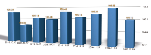 “中國·柯橋紡織指數”20161205期紡織品價格指數收報于105.10點,環比下跌0.41%,較年初上漲0.99%,同比上漲0.80%。 總價格指數
