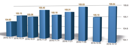 “中國·柯橋紡織指數”20161212期紡織品價格指數收報于105.54點,環比上漲0.42%,較年初上漲1.41%,同比上漲0.95%。 總價格指數