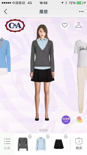 令人期待的是,“天貓煥新”正式推出“魔搭”虛擬搭配試衣間,為消費者提供穿衣搭配的解決方案。“魔搭”率先在淘寶和天貓無線端推出,目前,已經有TOPSHOP、GAP、Levi’s、速寫等130多個品牌為“魔搭”商品池提供近萬款商品,可以形成近百萬種搭配,消費者只要在手機上用手指輕輕一劃,就能看到服裝上身效果。