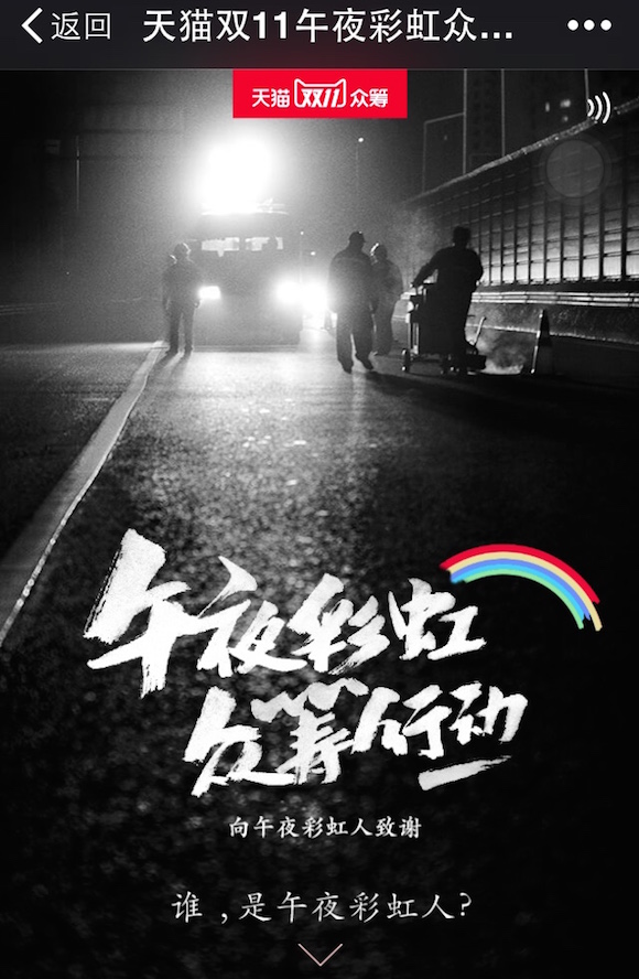 從溫情到魔性,天貓“雙十一”多種風格總有一種適合你在為天貓商城制作的另一支微信H5中,Karma公司又打出了“感情牌”——將焦點放在了雙十一幕后的工作人員,這些在半夜出行的快遞運輸司機成為了天貓“午夜彩虹 眾籌行動”中的主角。天貓希望通過視頻內容在微博、微信平臺上的傳播,讓公眾對快遞員、護士、巡警等夜間職業產生新的認識。