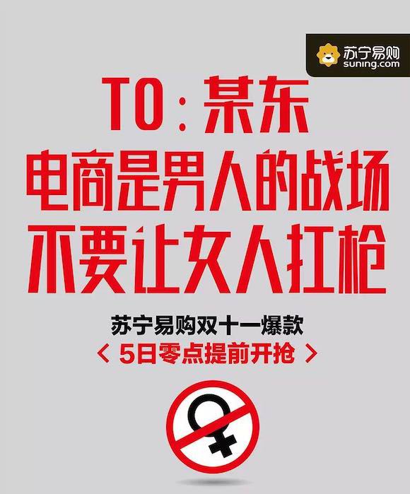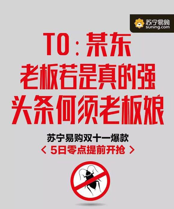 不過,在由“互黑”走向“結盟”之后,今年與阿里聯合的蘇寧易購則將炮火對準了京東。“過去我們不針對京東,因為怕別人說我們欺負小孩子,現在它企業也上市了,他們決定和京東實打實的干一場”,半月前,蘇寧云商集團副董事長孫為民在“雙十一”天貓北京發布會上曾這樣表示。 蘇寧的“約戰”很快變成了現實,11月4日,一組由蘇寧官方微信平臺推送的海報開始在社交網絡與平面媒體中瘋傳,其中“老板若是真的強 頭條何須老板娘”等文案,與海報中明顯的“蟑螂小強”符號直指京東商城CEO劉強東及其夫人章澤天。 這種針鋒相對的推廣方式自然容易成為人們津津樂道的話題,發布不過幾小時,這則推文已經超過了十萬閱讀數。