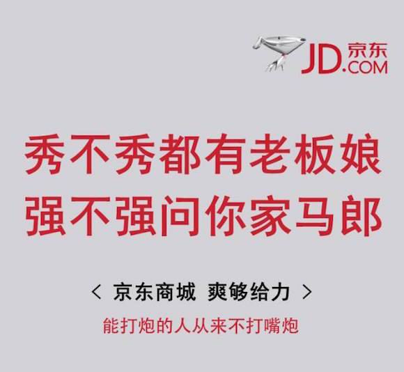 作為京東商城一直以來的“營銷法寶”,有“奶茶妹妹”之稱的章澤天與劉強東一路的戀情轉折都與京東的重大新聞如影隨形,今年的雙十一也不例外。11月初,一副奶茶妹妹宣布懷孕的朋友圈截圖就被“流傳”出去,稱職的她在公布喜訊時還不忘為京東母嬰產品打了廣告。 看著京東總是用“秀恩愛”來賺取眼球,蘇寧索性來了次“借勢營銷”,海報中的文案直白地表達了對京東利用奶茶妹妹做宣傳的諷刺,還不忘在下方擺上自家產品與京東相同產品的價格對比。 被蘇寧方面以此奚落了一番,第二天下午另一組言辭同樣犀利的海報橫空出世,文案中毫不掩飾地充斥著“打炮”“爽”“干爹”“馬郎”等直白低俗的字眼。