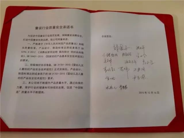 本刊記者—王賽 今天,巴拉巴拉、青蛙皇子、今童王、紅黃藍、小豬班納、派克蘭帝、綠盒子等童裝品牌負責人在一份質量安全承諾書上鄭重地簽上了品牌的名字。