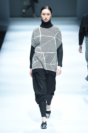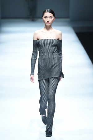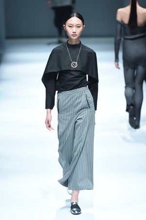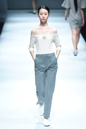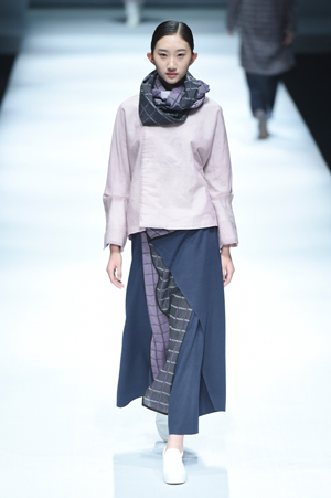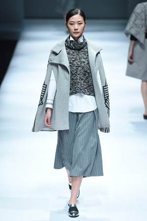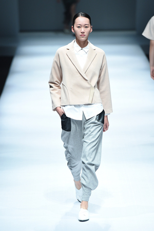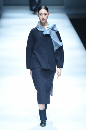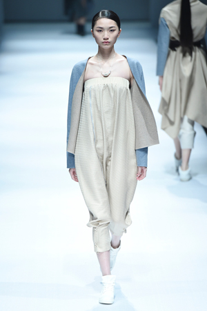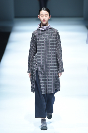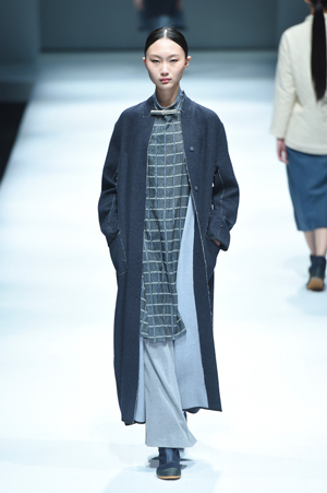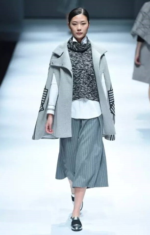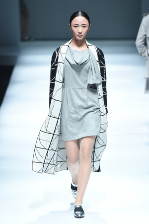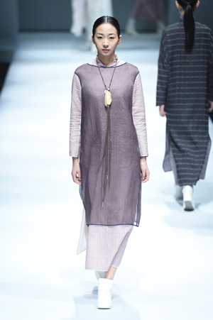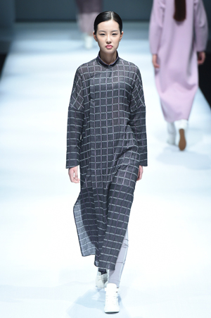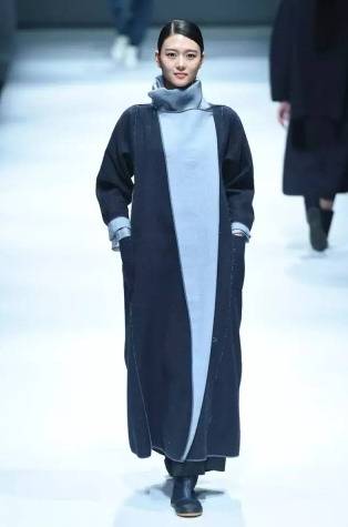 模特們被包裹在米色、藍色、藕荷等偏于自然的色系中,傳統的立領、斜襟、袍褂結合進了現代生活的實際需求,天然材質做出了豐富的肌理變化,整體感覺質樸而從容,表達出一種文化自信的覺醒。 徐一衛剛剛從紐約回來,她的服裝已在美國開始銷售,下一步是國內。帶著在國際知名品牌公司的工作歷練,她的作品黑白灰的都市風烙印明顯,成衣化的感覺很突出,實穿性強。