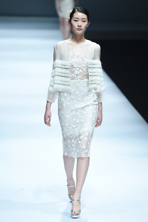 郭柯冰的設計有高級定制和高級成衣兩個方向,追求簡約、干凈的設計。蕾絲、鑲珠、刺繡的精致配以不同材質的鑲拼,綴有紅藍小花的一款白裙透出童真。
