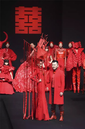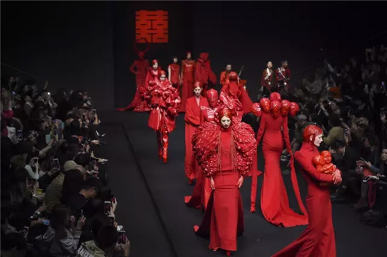 看點(diǎn)三 SheguangHu·胡社光:是你想要的“囍”紅嗎? 胡社光這個(gè)名字,近些年越來越自帶光芒,時(shí)尚圈內(nèi)外似乎無人不曉,路人甲也能拿那套“花棉襖”侃侃時(shí)尚,無論你喜不喜歡“花布棉襖”,或者需不需要“病號(hào)服”,不得不承認(rèn),胡社光很“紅”。 無論是江河山川之紅、喜宴慶典之紅、京劇國(guó)粹之紅、生命靈性之紅都匯聚成這一系列的主題色調(diào),附加在了這一系列作品的主題:中國(guó)人最喜歡的“囍”字上。