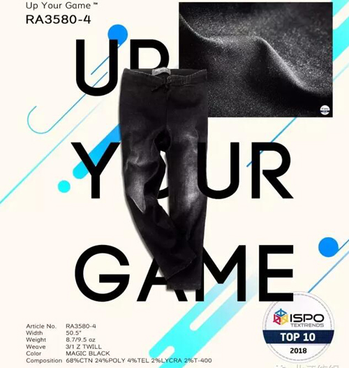 UpYour Game?超能牛仔面料RA3580-4被評選為2016年度十大“街頭運動”材料。此款面料是北江紡織在功能性牛仔領(lǐng)域的創(chuàng)新力作,采用特殊功能性纖維制成,內(nèi)含多種天然礦物質(zhì),可以吸收人體散發(fā)的熱量并轉(zhuǎn)換為遠紅外線再滲透入肌肉組織,可顯著增加人體血氧含量與平衡身體溫度,測試證明可平均提升TCPO2值高達12%,而天絲?與萊卡?纖維的加入,則帶來更佳手感和彈力表現(xiàn)。此外,魔術(shù)黑染色打造的深黑色又極契合時下流行風尚。