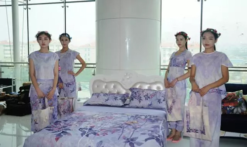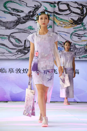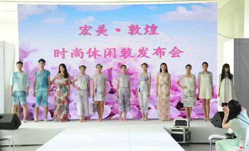 會議由馳馬拉鏈駐魯辦總經理王定忠主持,青島職業技術學院空乘專業的俊男靚女登臺熱場! 中國紡織服裝教育學會秘書長紀曉峰對本次活動給予肯定,宏美股份與時俱進,率先引進意大利產的MS數碼印花機,實現了低碳環保,綠色生態,緊跟時代潮流,也具有巨大的社會意義,生產過程零排放,實為造福子孫后代的壯舉。他祝愿宏美股份健康發展,做數碼印花的領航者。 低調風雅的宏美股份董事長李瑞福做了簡短的歡迎致辭,感謝行業協會領導眾多行業媒體及關心支持宏美發展的各界朋友蒞臨現場,為了不讓人類的眼淚成為地球上最后一滴水而努力。 宏美股份產品設計總監王澤輝闡述新品發布會的三大設計理念。姻緣?姹紫嫣紅篇章的設計靈感來自對敦煌藝術的追求,取決于設計者在大學所學的專業。王澤輝講到“1988年暑期當我初來敦煌莫高窟失望、徘徊在莫高窟汽車站的時候,有幸遇到了一位老人,當老人聽說面前的年輕人想要了解、研究敦煌藝術時,就非常熱情地接納了我并邀請到家里中居住,毫無保留地為我講述敦煌的故事,是我通向敦煌藝術殿堂的啟蒙老師,這位老師就是著名的敦煌學家霍熙亮先生。”本系列以淺紫色為主,浪漫典雅,向人們訴說著發生在敦煌的這段故事。通過漠海流動的曲線作為元素符號,面料以棉麻竹節紋、絹紗為主,運用現代數碼印花工藝技術,充分體現了敦煌的獨特風情。 踐跡?花團錦簇篇章的設計靈感來自莫高窟壁畫藝術的飛天。提起敦煌莫高窟藝術,人們就會想到神奇的飛天。她是敦煌莫高窟藝術中最著名、最具代表性的藝術造型之一。在莫高窟五百個洞窟中飛天形象出現了四千五百余型。將這些飛天、寶相花、祥云以線的疏密組合為骨架,采用點、線、面抽象藝術的表現手法,喻演著莫高窟飛天們那優美輕捷、漫天飛舞的神魂,陽光普照、香氣繚繞,在茫茫的漠海中,她們女性身軀合著音樂的節拍,用綿長的飄帶和優美的舞姿,散發著濃濃的異香,給人間帶來平安與吉祥。以白、淺藍淡色調為主,用中國敦煌莫高窟佛教藝術元素統領全局,在款式、面料、色彩、圖案、變化中求統一。本系列服裝面料以雪紡、絹紗為主,運用現代數碼印花工藝技術,將寶相花、飛天、祥云等元素符號充分體現。 吉祥?繁花似錦篇章的靈感依舊與敦煌有關,敦煌藝術作為傳統文化的代表,是各民族賴以生存的土壤,根植本土文化的設計元素,把中華服飾那種飄逸、自然、隨意蓄的精髓完美體現出來。才能創造出絢麗的作品。運用莫高窟佛教的壁畫手繪方法,把忍冬花、卷草紋等充滿濃郁莫高窟藝術的東方氣息的符號設計繪制于沙灘裝當中,令人耳目一新。這款家居休閑裝以寬松、飄逸、自然為主調風格,把中華服飾那種飄逸、自然、隨意蓄的精髓完美體現出來。敦煌壁畫的暈染法,從敦煌色彩學當中吸收大量使用色相純度極高的藍靛色和石青、石綠等間以土紅色、白色等。將忍冬花、卷草紋等元素通過現代數碼印花工藝技術,在真絲緞、絹紗為主的面料上充分體現。