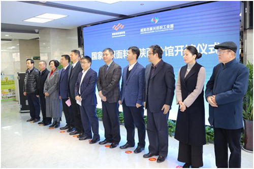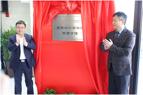 中國紡織工程學(xué)會常務(wù)副理事長伏廣偉和咸陽市副市長張小平為國家紡織面料館陜西分館揭牌。