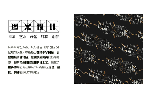 《禮育校園》系列在圖案設(shè)計(jì)上以蘆葦為切入點(diǎn),充分融合《河北雄安新區(qū)規(guī)劃綱要》中所指出的弘揚(yáng)中華風(fēng)范,彰顯地域文化特色,展現(xiàn)創(chuàng)新風(fēng)尚的核心思想,將蘆葦畫(huà)的形態(tài)和制作工藝,轉(zhuǎn)化成服裝圖案運(yùn)用在服裝中,符合新區(qū)綠色、智能、創(chuàng)新的核心發(fā)展理念。也彰顯了傳承、藝術(shù)、綠色、環(huán)保、創(chuàng)新相結(jié)合的設(shè)計(jì)追求。