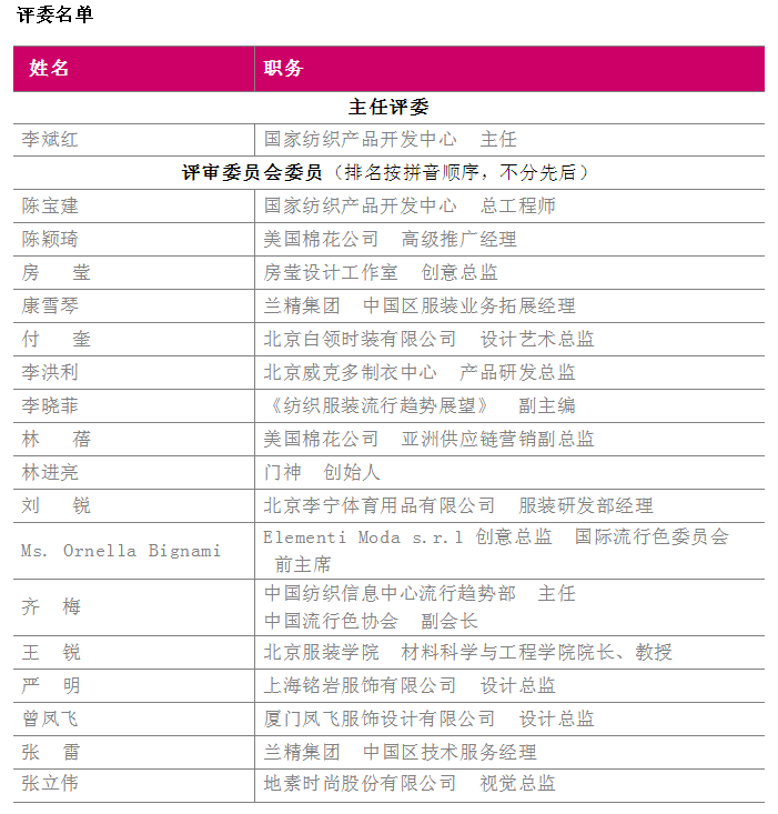 一貫“高配”的評審專家陣容是大賽長期以來保持高專業水準的一個重要因素。此次評審團由來自美國棉花公司、北京服裝學院、房瑩設計工作室、蘭精集團、北京白領時裝有限公司、北京威克多制衣中心、門神、北京李寧體育用品有限公司、Elementi Moda s.r.l、中國紡織信息中心、中國流行色協會、上海銘巖服飾有限公司、廈門鳳飛服飾設計有限公司、地素時尚股份有限公司的紡織品開發專家、流行趨勢研究專家、服裝品牌設計師、技術研發專家、采購商代表組成。