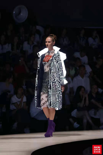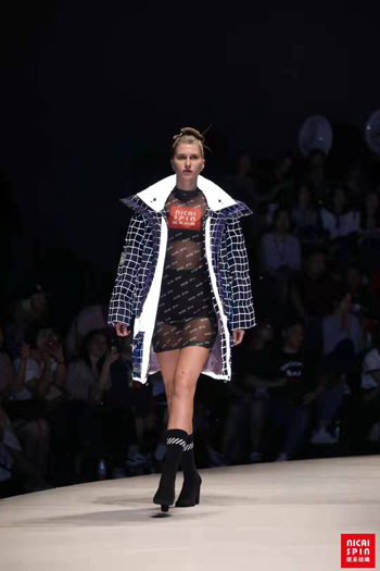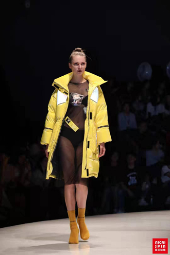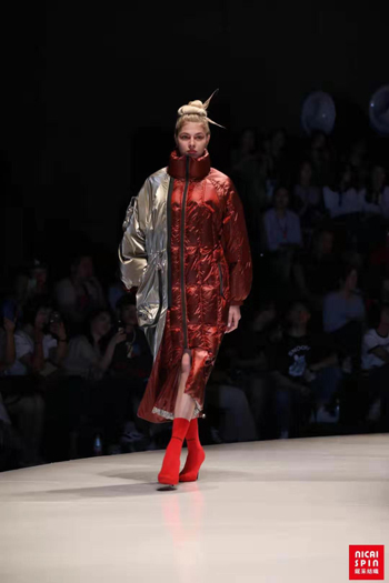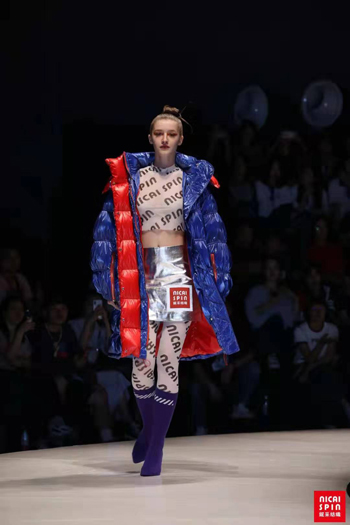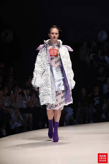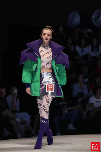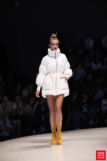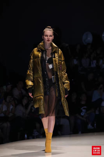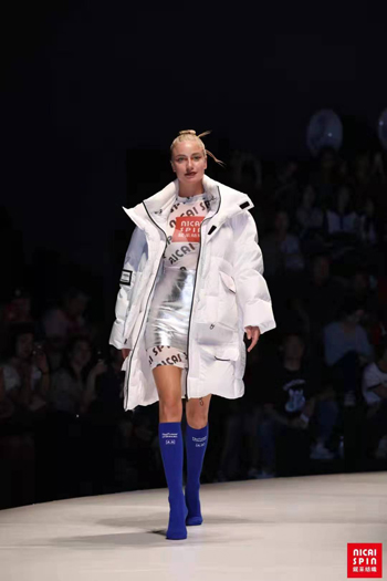 現場,57款個性風潮的羽絨服以簡潔素白為基底,銀河藍、火爐紅、紫藤色、明黃色等高飽和色彩點綴,在簡約與有趣間平衡延展,令羽絨服綻放跳躍活力,顛覆傳統冬日羽絨的單調乏味。“此次發布秀系列靈感來自于國潮設計師chenpeng的作品,通過Oversize的寬松廓形、拼接印花以及高飽和度色彩的多維運用,立體呈現鈮采紡織匠心研發的時尚科技面料。”鈮采紡織相關負責人介紹說,其中一款最新研發的科技反光面料在閃光燈的照射下能讓面料呈現出像交卷一樣的光感,兼具時尚感與功能性。