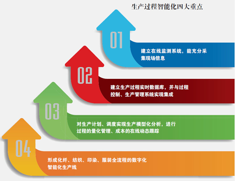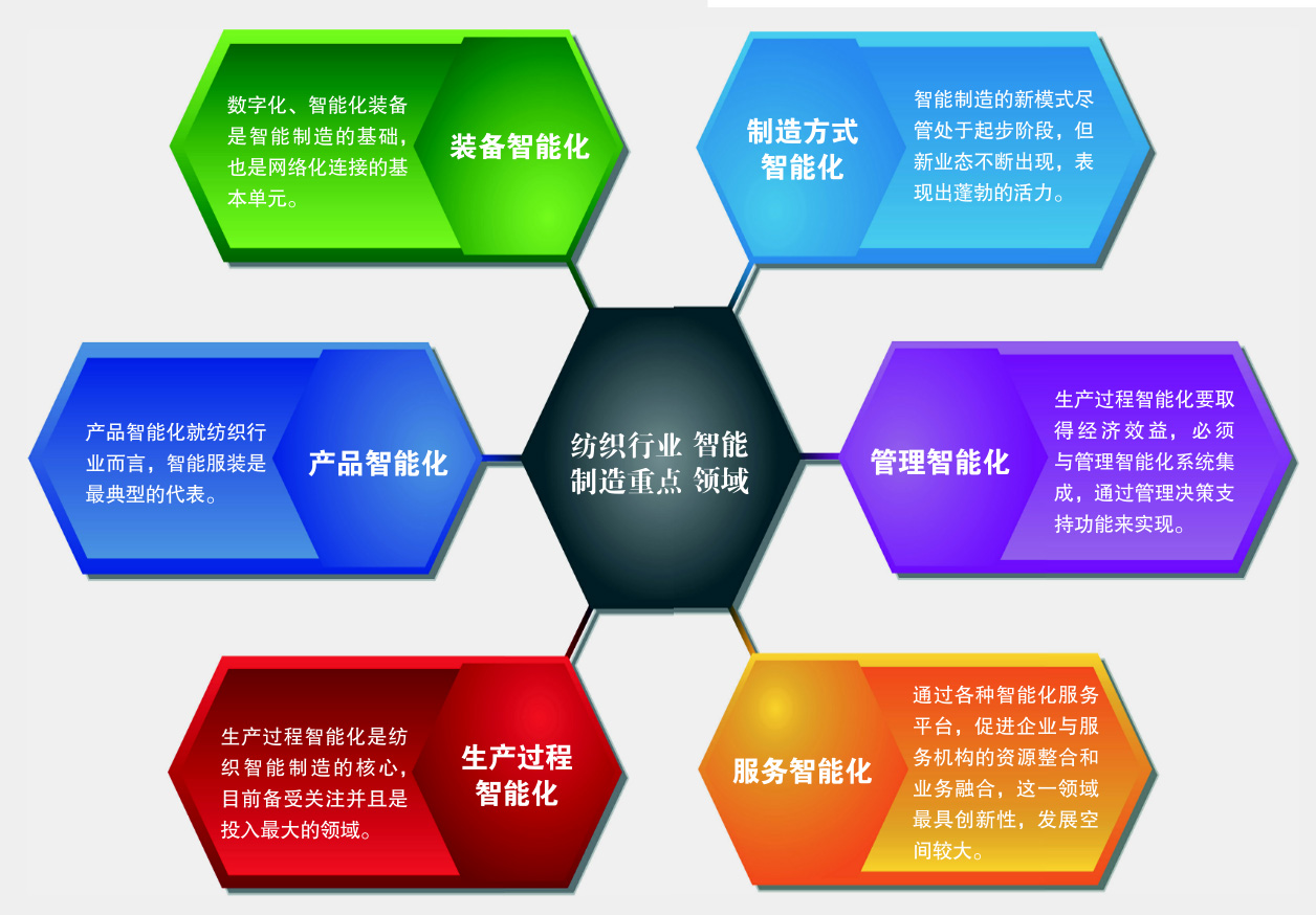 在多年來推進兩化融合的過程中,紡織工業面臨諸多未能根本解決的困難和問題,如生產制造環節的數字化、智能化一直是個難點,亟待有所突破。智能制造及其一系列新技術的開發和應用,勢必給解決這些問題帶來新的思路和新的路徑,突破某些關鍵環節的瓶頸,帶動行業整體信息化水平的提升。工信部在2015年工作計劃中,對傳統行業給予了關注,明確選擇鋼鐵、石化、紡織、輕工、電子信息等領域開展智能制造的應用示范,組織實施關鍵工序智能化工程。 鑒于紡織行業自身的特點,下面分幾個方面對紡織智能制造的實施范圍和領域、推進的路徑和重點進行探討和研究,主要分析不同領域在智能制造中的地位、重要性、現有基礎和發展設想,以便采取有效的方式加以推進。