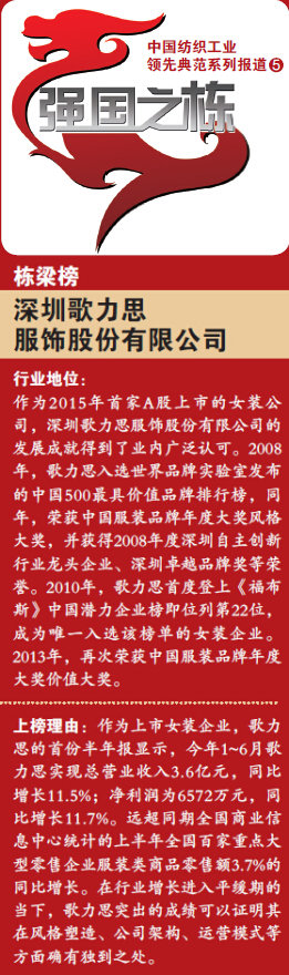 2015年4月22日,歌力思以2015年A股第一家女裝上市公司的身份亮相上交所。近期,公司的首份半年報顯示,今年1~6月歌力思實現(xiàn)總營業(yè)收入3.6億元,同比增長11.5%,凈利潤為6572萬元,同比增長11.7%。遠超同期全國商業(yè)信息中心統(tǒng)計的,上半年全國百家重點大型零售企業(yè)服裝類商品零售額3.7%的同比增長。