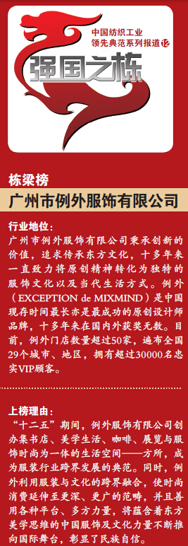 2004年那次“大換血”的后果是大幅關(guān)店,而這一次大規(guī)模的渠道梳理反而讓“例外”獲得重生,并精準(zhǔn)定位在利潤空間較大的高端女性服裝市場(chǎng)。當(dāng)時(shí)毛繼鴻做了大量市場(chǎng)調(diào)研,市場(chǎng)上缺乏能滿足高端女性消費(fèi)需求的本土原創(chuàng)設(shè)計(jì)師品牌;而這個(gè)客戶群有一個(gè)顯著特點(diǎn),就是愿意為附有情感訴求的高價(jià)產(chǎn)品買單。 2005年開始,“例外”著手將品牌的獨(dú)特性武裝到面料,針?biāo)罂椆ぷ魇摇⒚椆ぷ魇摇⑴浼ぷ魇摇⑷菊麑?shí)驗(yàn)室、品質(zhì)實(shí)驗(yàn)室,五個(gè)實(shí)驗(yàn)室相繼成立。有人說這是毛繼鴻對(duì)貝爾實(shí)驗(yàn)室的仿效,但是這種在布料上慢工出細(xì)活的考究,完全是“例外”價(jià)值主張的體現(xiàn),同時(shí),又為品牌一貫對(duì)民間工藝的傳承打下技術(shù)基礎(chǔ)。 通過這五個(gè)實(shí)驗(yàn)室,“例外”進(jìn)行了包括布料、設(shè)計(jì)、品牌等前端研發(fā)。毛繼鴻舉例說,他們研發(fā)了一款名為針毛的布料,用針將棉絨插到面料中,呈現(xiàn)出一種山水畫的感覺。此外,目前只在廣州“方所”銷售的“例外”男裝,也是他們實(shí)驗(yàn)室旗下的研發(fā)產(chǎn)品。