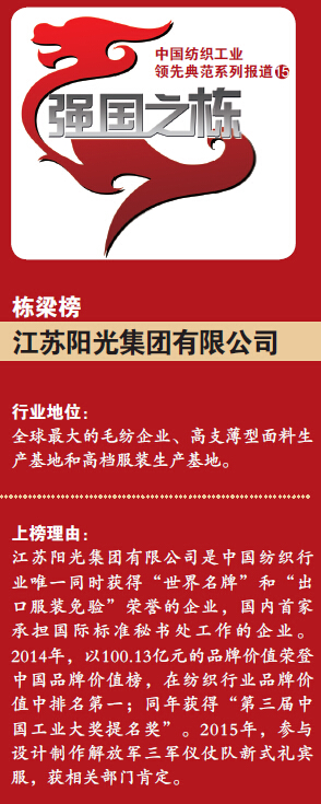 近年來,陽光以“緯線”為基準,通過“經線”的不斷改進和延伸,編織出陽光呢絨和服裝的“錦繡華章”:陽光集團先后通過了ISO9001、ISO14001、OHSAS18001等五體系認證; 2013年,陽光集團榮獲“中國工業大獎提名獎”;2014年,榮獲“江蘇省質量獎”。