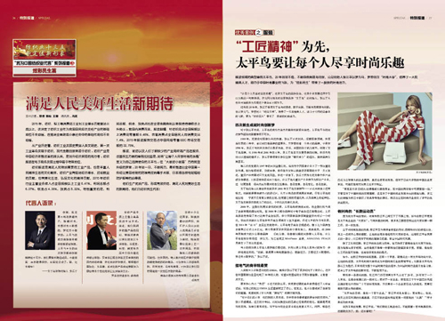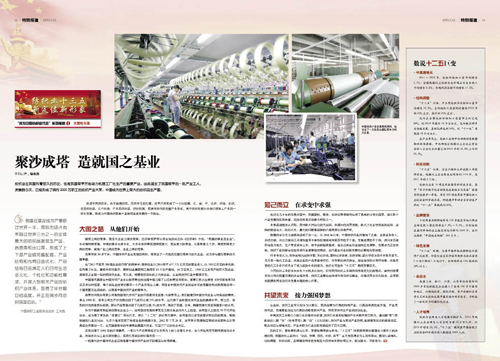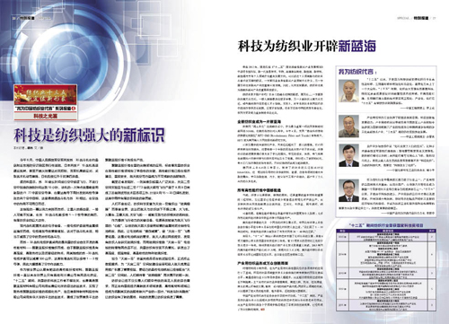 ●大國柱石篇展現(xiàn)了中國紡織產(chǎn)業(yè)的不斷崛起與持續(xù)輝煌。報(bào)道以恒天、魏橋、紅領(lǐng)等企業(yè)為縮影,記錄了一批中國紡織企業(yè)的強(qiáng)大。中國恒天集團(tuán)董事長(zhǎng)張杰在文中談到,每個(gè)制造業(yè)的背后都有一個(gè)產(chǎn)業(yè)系統(tǒng)在支撐,而目前中國紡織產(chǎn)業(yè)制造體系的完整性和成熟度是任何一個(gè)國家都無法超越的,這就是中國紡織產(chǎn)業(yè)的競(jìng)爭(zhēng)力。 ●生態(tài)文明篇體現(xiàn)了紡織工業(yè)的歷史擔(dān)當(dāng)。中國紡織工業(yè)聯(lián)合會(huì)副會(huì)長(zhǎng)、中國生態(tài)文明研究與促進(jìn)會(huì)紡織工作委員會(huì)主任孫淮濱明確指出:“紡織行業(yè)被選定為國家生態(tài)文明建設(shè)的三個(gè)試點(diǎn)行業(yè)之一,伴隨著紡織行業(yè)發(fā)展步入轉(zhuǎn)型升級(jí)的新常態(tài),行業(yè)也開啟了生態(tài)文明建設(shè)的新征程,這是我們?cè)诳沙掷m(xù)發(fā)展道路上的一種新的歷史擔(dān)當(dāng)。” ●炫彩民生篇總結(jié)了服裝、家紡以及社會(huì)了解較少的產(chǎn)業(yè)用終端產(chǎn)品的豐富內(nèi)涵、消費(fèi)動(dòng)向和發(fā)展趨勢(shì)。報(bào)道展示了紡織業(yè)對(duì)社會(huì)和人民生活的全方位貢獻(xiàn)。一批優(yōu)秀的企業(yè)通過生產(chǎn)優(yōu)質(zhì)產(chǎn)品,形成有效供給,滿足人民對(duì)美好生活的新期待,為改善民生添彩助力。 ●科技之光篇梳理了“十二五”期間,我國紡織工業(yè)在尖端領(lǐng)域取得的驕人業(yè)績(jī)。這些成績(jī)證明紡織業(yè)已經(jīng)不僅僅是人們眼中傳統(tǒng)的滿足人民的穿衣需求,而正在向國民經(jīng)濟(jì)高新技術(shù)領(lǐng)域滲透,高性能材料領(lǐng)域已經(jīng)成為名副其實(shí)的戰(zhàn)略性新興產(chǎn)業(yè)的一部分,科技與時(shí)尚融合讓紡織業(yè)有了新的屬性,科技的發(fā)展讓紡織業(yè)煥發(fā)了青春。 ●國際新優(yōu)勢(shì)篇亮出了紡織工業(yè)的全新競(jìng)爭(zhēng)優(yōu)勢(shì)。中國紡織工業(yè)聯(lián)合會(huì)秘書長(zhǎng)高勇指出,智能制造重點(diǎn)工程要重點(diǎn)發(fā)展一批數(shù)字化、網(wǎng)絡(luò)化、智能化裝備和生產(chǎn)線,而紡織新材料重點(diǎn)工程將重點(diǎn)發(fā)展一批纖維新材料和產(chǎn)業(yè)用紡織品。要重點(diǎn)發(fā)展紡紗、滌綸長(zhǎng)絲、印染、針織、非織造布、服裝等6條智能化生產(chǎn)線,實(shí)現(xiàn)后能使我國紡織工業(yè)基本脫離勞動(dòng)密集型生產(chǎn)。 不止步于苦練內(nèi)功,中國紡織服裝業(yè)也正審時(shí)度勢(shì)“走出去”。中國紡織工業(yè)聯(lián)合會(huì)副會(huì)長(zhǎng)、中國國際貿(mào)易促進(jìn)委員會(huì)紡織行業(yè)分會(huì)常務(wù)副會(huì)長(zhǎng)徐迎新表示,“‘十三五’期間,中國紡織行業(yè)‘走出去’是結(jié)構(gòu)調(diào)整布局的必然趨勢(shì),是產(chǎn)業(yè)國際競(jìng)爭(zhēng)優(yōu)勢(shì)的自然延伸?!?/font> ●多彩時(shí)尚篇也詮釋了紡織服裝產(chǎn)業(yè)的全新定位。從紗線到面料,再到服裝、家紡等終端產(chǎn)品,時(shí)尚的傳導(dǎo)作用不容忽視。時(shí)尚產(chǎn)業(yè),必須成為紡織服裝行業(yè)未來發(fā)展的個(gè)性標(biāo)注;時(shí)尚經(jīng)濟(jì),也必然成為添加時(shí)代魅力的行業(yè)名片。 對(duì)此,中國紡織工業(yè)聯(lián)合會(huì)副會(huì)長(zhǎng)、中國服裝協(xié)會(huì)常務(wù)副會(huì)長(zhǎng)陳大鵬發(fā)出了這樣的呼聲:“中國服裝行業(yè)已經(jīng)走到了一個(gè)全新的轉(zhuǎn)折點(diǎn)和分水嶺。行業(yè)的全面升級(jí)將表現(xiàn)在創(chuàng)造力、創(chuàng)新力以及價(jià)值創(chuàng)造力上,尤其表現(xiàn)在品牌建設(shè)、文化建設(shè)以及時(shí)尚話語權(quán)方面的提升,整個(gè)產(chǎn)業(yè)向中高端邁進(jìn)。” ●質(zhì)量建設(shè)篇展現(xiàn)了紡織服裝行業(yè)質(zhì)量建設(shè)的優(yōu)良傳統(tǒng)與執(zhí)著堅(jiān)守。質(zhì)量,是行業(yè)對(duì)社會(huì)無聲的承諾。風(fēng)風(fēng)雨雨近四十載,我國紡織服裝行業(yè)的質(zhì)量建設(shè)取得的成績(jī)令人矚目。中國紡織信息中心副主任、中國紡織工業(yè)聯(lián)合會(huì)檢測(cè)中心主任伏廣偉站在檢測(cè)角度發(fā)聲,“正因身處大工業(yè)時(shí)代轉(zhuǎn)型期,工匠精神才彌足珍貴,對(duì)產(chǎn)品精雕細(xì)琢、精益求精、追求完美的精神理應(yīng)被追尋和弘揚(yáng)。匠心不滅,價(jià)值回歸,紡織服裝行業(yè)的美麗明天更加令人期待?!?/font> ●文化自信篇讓我們領(lǐng)略到紡織服裝產(chǎn)業(yè)充滿魅力的發(fā)展成果與瑰麗未來。無用、愛慕、NE·TIGER掌門人紛紛出鏡,而中國服裝設(shè)計(jì)師協(xié)會(huì)主席張慶輝表示,文化自信是一個(gè)整體的概念,并不能一蹴而就。在設(shè)計(jì)領(lǐng)域,文化自信體現(xiàn)在設(shè)計(jì)符合我們個(gè)性化審美需求、具有東方文化美學(xué)的設(shè)計(jì)作品中,這會(huì)成為未來的一個(gè)發(fā)展方向,我們有理由對(duì)自己的文化、對(duì)我們的時(shí)尚產(chǎn)業(yè)表達(dá)足夠的信心。
